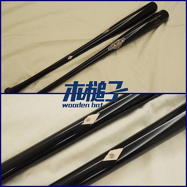 圖片是黑色握把球棒,MLB的木材認證戳章呈現的樣子